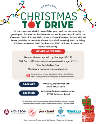 Drop-off Your Donations: If you prefer, you can drop off your generous donations of toys and non-perishable food items directly at the Acheson Business Association office during our regular business hours, from October 15th to December 4th.