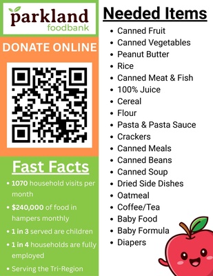 For the Food Bank: Help us stock the shelves for local families. A sheet of the most-needed food bank items is attached below, but staple items like non-perishable goods, pantry items, and canned goods are always appreciated.