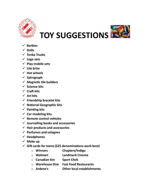 For Toys: We're collecting new, unwrapped toys for children of all ages. For teenagers, we are also looking for gift cards in $25 increments. Our most requested items include: