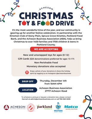 Drop-off Your Donations: If you prefer, you can drop off your generous donations of toys and non-perishable food items directly at the Acheson Business Association office during our regular business hours, from October 15th to December 4th.